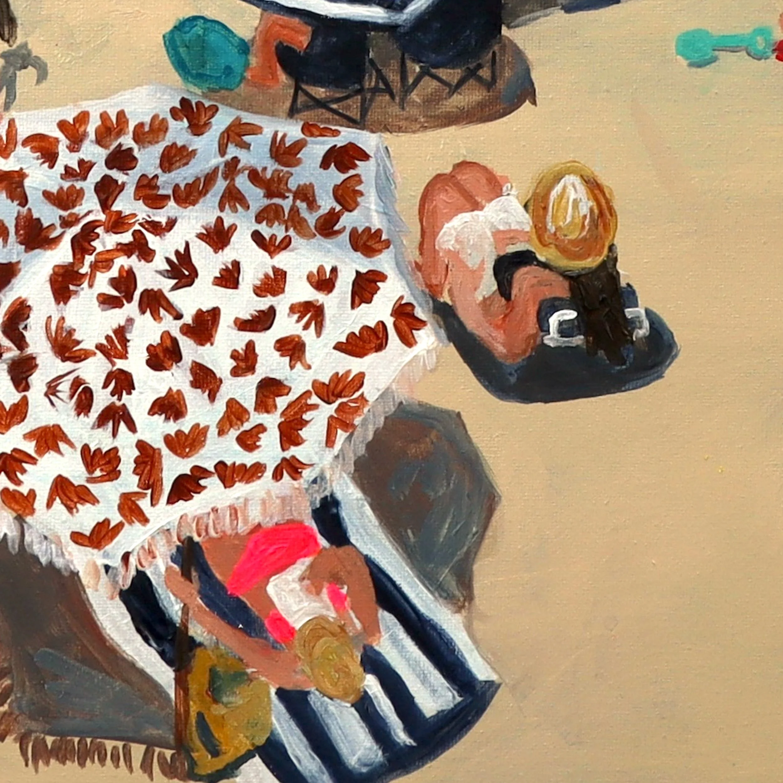 Umbrellas by the Bay - Original painting by Australian Artist Rachel Rae - Bustling with seaside activity, 'Umbrellas by the Bay' bursts with the vibrant energy of a crowded beach day.