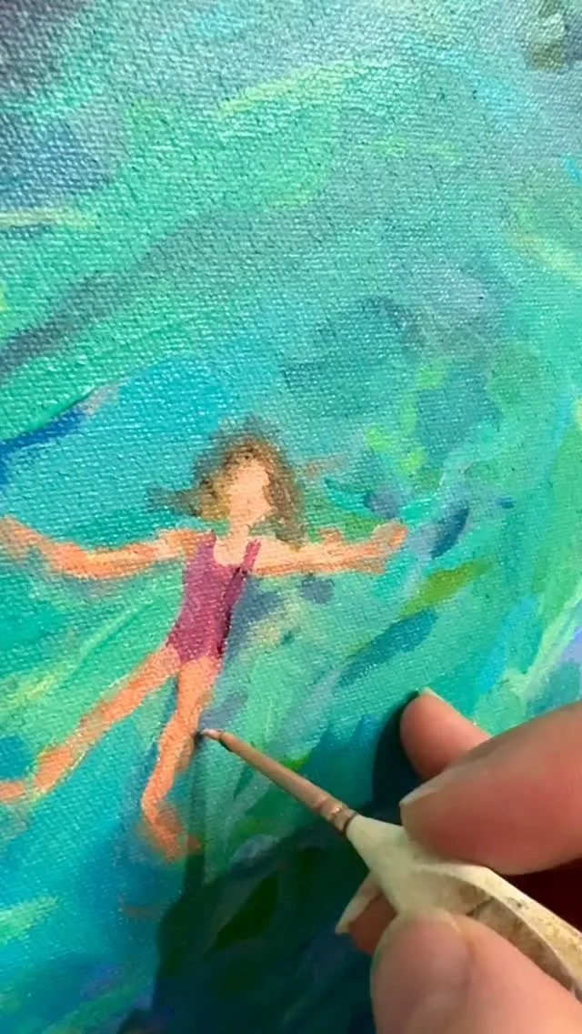 Saltwater Companions captures a quiet, sunlit moment as three women stand on the rocks, watching a white dog play in the waves. With expressive brushstrokes and rich coastal hues, this piece celebrates friendship, freedom, and the simple joy of being present by the sea.